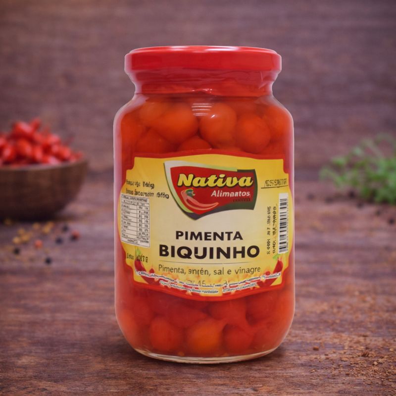 DESCRIÇÃO: Pimenta Biquinho em Conserva 300g MARCA: Nativa INGREDIENTES: Vinagre e Pimenta tipo biquinho. Nível de ardência: Baixo A pimenta biquinho ou pimenta-de-biquinho é uma pimenta que ganhou fama e popularidade de forma extremamente rápida aqui no Brasil. Isso porque ela apresenta pungência (ardência) baixa, o qu permite que sejam consumidas de maneira muito agradavel. Serve como um bom petisco, vai bem em saladas e como acompanhamento de pratos. Como a pimenta biquinho não arde, pode ser consumida até por criancas. Além disso, é bonita e enfeita os pratos e saladas.