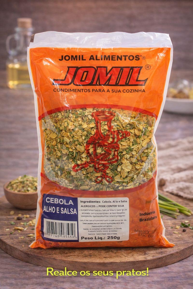 DESCRIÇÃO: Produto constituído por cebola desidratada granulada, alho desidratado granulado e salsa desidratada flocos, em conformidade com os requisitos da indústria alimentícia.não contém glúten. INFORMAÇÃO NUTRICIONAL: porção de 5g (1 colher de chá): não contém quantidade significativa de valor energético, carboidratos, sódio, proteínas, gorduras totais, gorduras saturadas, gorduras trans e fibra alimentar?. *Valores diários com base em uma dieta de 2000Kcal ou 8400KJ. Seus valores diários podem ser maiores ou menores dependendo de suas necessidades energéticas.
