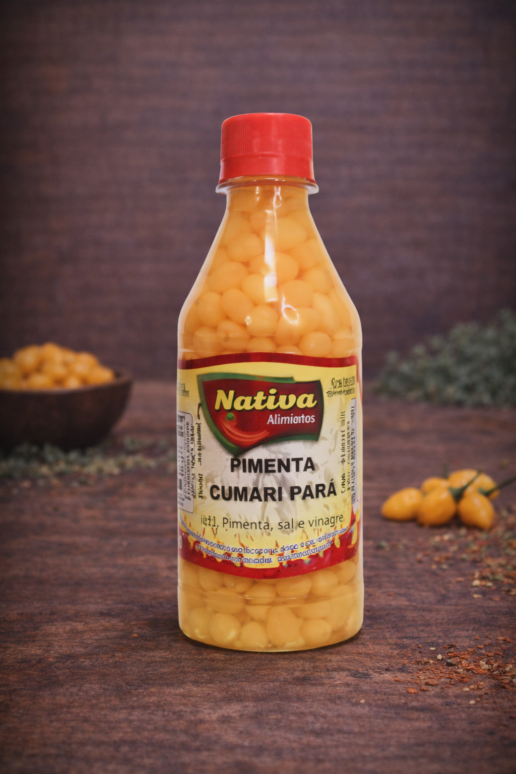 DESCRIÇÃO: Pimenta Cumari em Conserva 90g MARCA: Nativa INGREDIENTES: Vinagre e Pimenta tipo Cumari. Nível de ardência: Alto A pimenta Cumari Cumari-do-Para é uma pimenta que ganhou fama e popularidade de forma extremamente rápida aqui no Brasil. Isso porque ela apresenta pungência (ardência) alta.