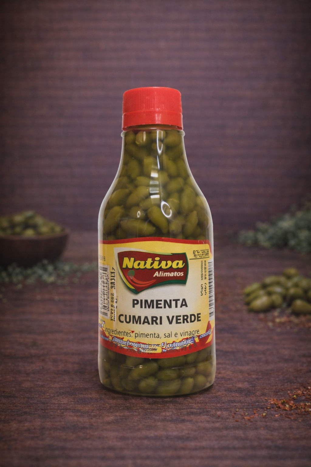 DESCRIÇÃO: Pimenta Cumari Verde em Conserva 90g MARCA: Nativa INGREDIENTES: Vinagre e Pimenta tipo Cumari. Nível de ardência: Alto A pimenta Cumari Verde é uma pimenta que ganhou fama e popularidade de forma extremamente rápida aqui no Brasil. Isso porque ela apresenta pungência (ardência) alta.